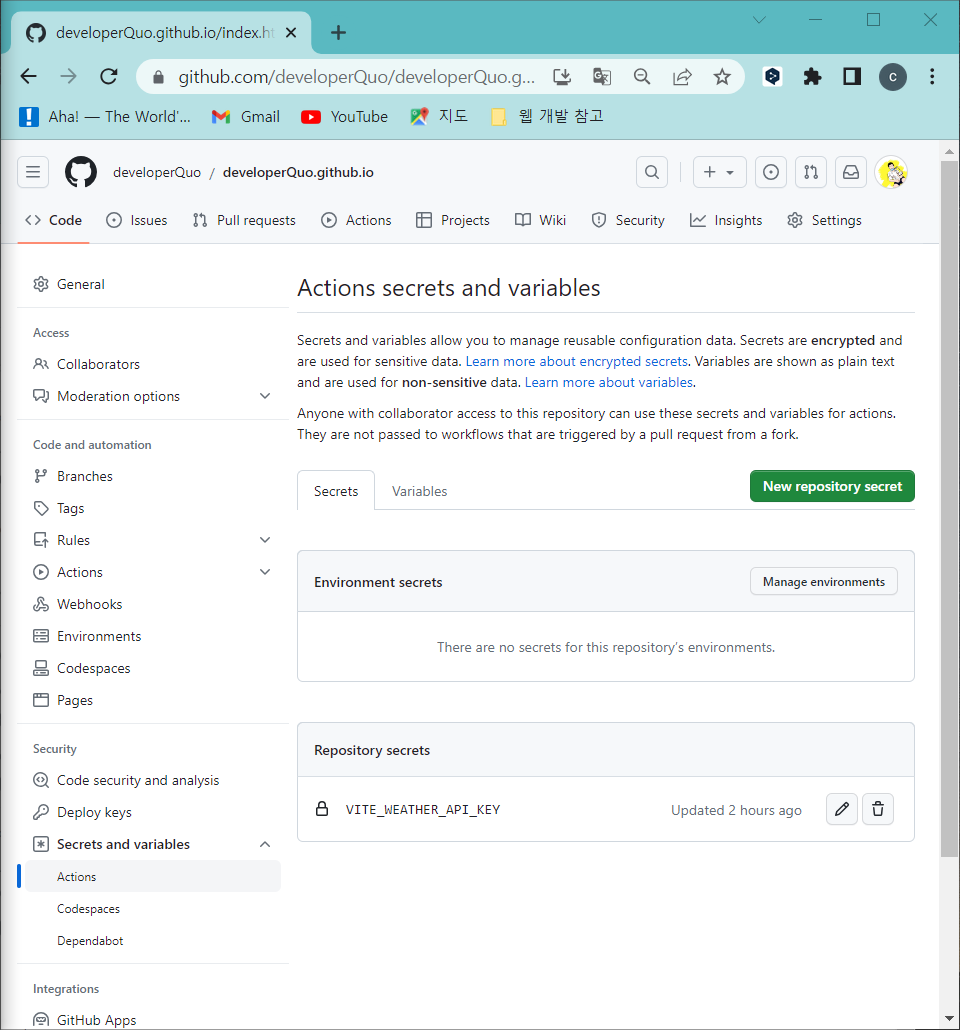 ※ github actions와 env variables github actions에서 env variables를 사용하기 위해 repository settings의 repository Environment secrets를 등록해 뒀었습니다. 하지만 repository 이름을 변경하니, secret을 인식하지 못하는 에러가 같이 발생했습니다. 그래서 기존 Environment secret을 삭제하고, Repository secrets에 새로 등록하니 actions에서 정상적으로 인식되었습니다.