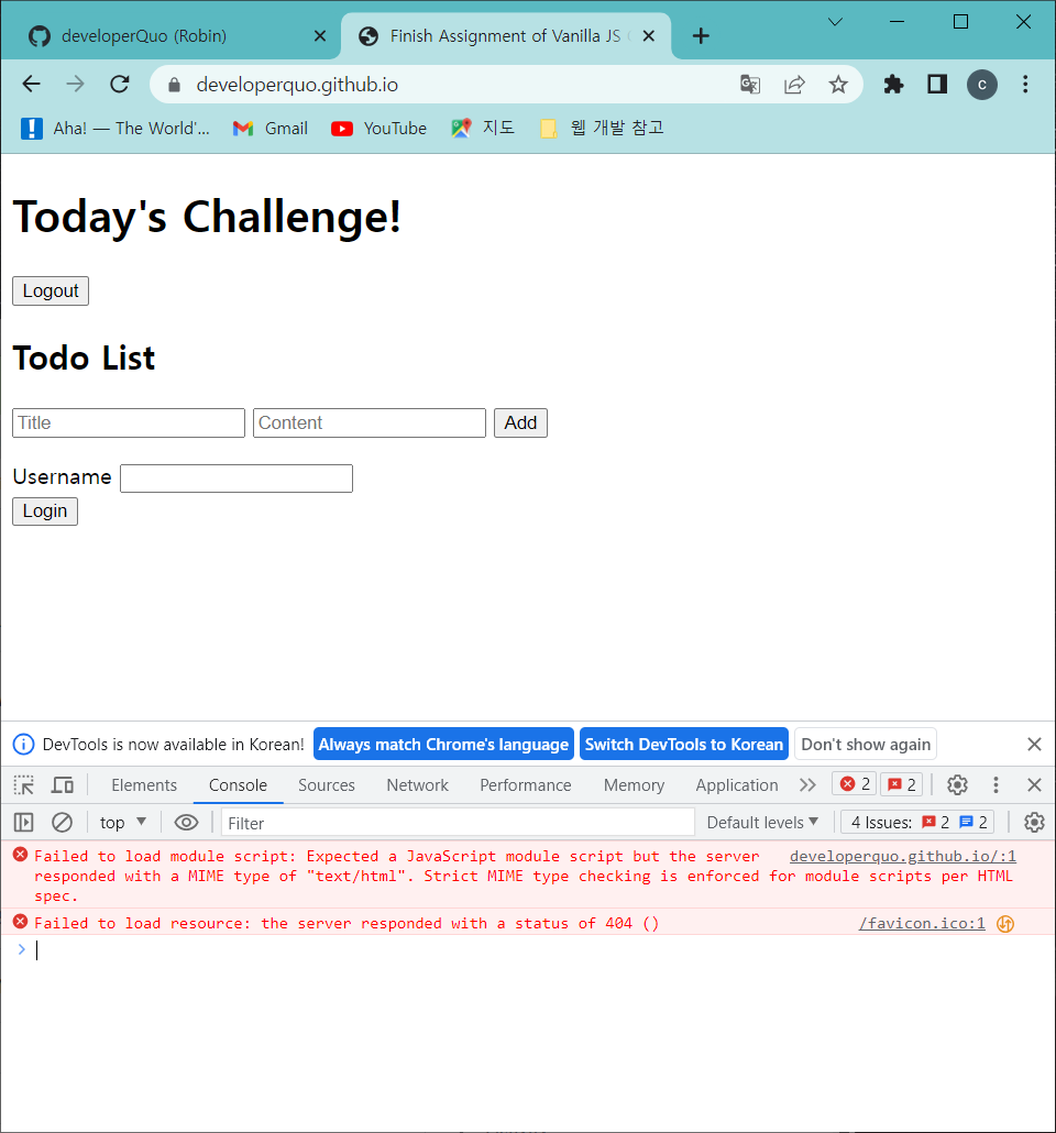 초기에는 github page가 레포지토리 이름으로 렌더링 되도록 설정했습니다. 이후 정상적으로 배포되는 걸 확인한 후, url이 github.io로 끝나도록(https://{username}.github.io) 변경하기 위해,github 저장소 이름(developerquo.github.io)을 변경했었습니다. 하지만 이때부터, js module을 읽지 못한다는 콘솔 에러가 발생했습니다.그리고 개발 환경의 빌드, 배포 작업에서는 같은 이슈가 발생하지 않아 혼란스러웠습니다.