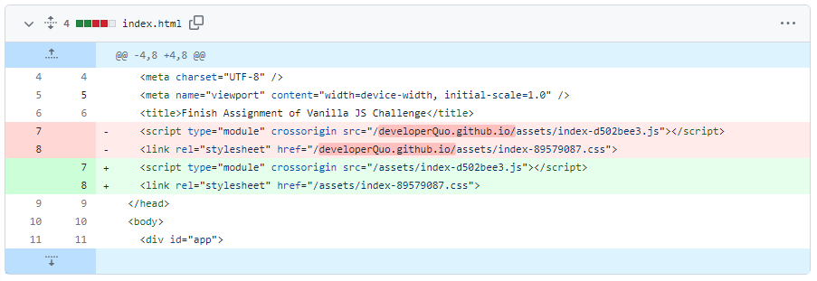 vite.config.js 코드 수정 이후, github actions로 build 된 asset의 index.html은 다음과 같이 수정되어 있었습니다.