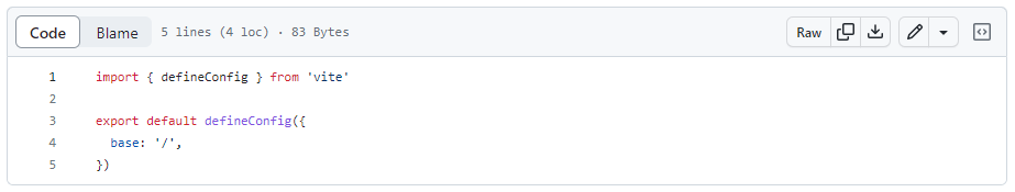 배포 초기에는 https://<USERNAME>.github.io/<REPO>/와 같이 배포를 했기에, base: /<REPO>/와 같이 설정했습니다. 하지만 url을 https://<USERNAME>.github.io로 배포하도록 변경하는 과정에서, 이를 업데이트하지 않았습니다. 변경 당시, Vite.js에서 이 설정 파일과 변수가 어떤 역할을 하는지 정확히 이해하지 않았습니다. 공식 문서를 확인한 후에는, 아래 이미지와 같이 기본 base url로 변경했습니다.