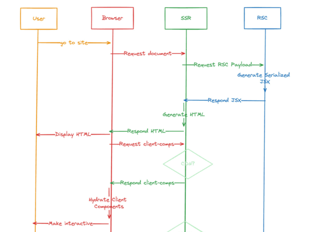 사용자가 접속하면, 브라우저는 서버에 페이지를 요청합니다. SSR 서버는 RSC Payload를 리액트 서버에 요청합니다.
